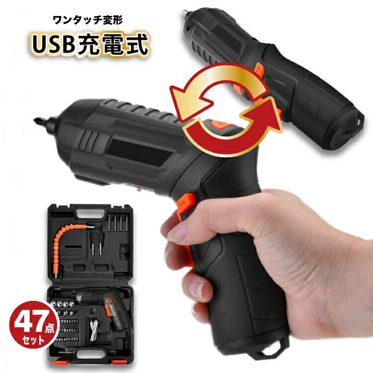電動ドライバー 充電式 USB 小型 安い 電動ドライバーセット コードレス 工具 DIY 47点 セット LEDライト 専用ケース付き ドリル ビット 2way L字 ストレート